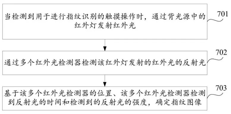 當設(shè)備檢測到用戶進行指紋識別的觸摸操作時,用戶的手指正貼近在LCD面板上,所以此時可以使用背光源中的紅外燈和多個紅外光檢測器來進行指紋識別。由于手指的表皮層和真皮層對紅外光的反射時間不同,并且紅外光在手指的表皮層和真皮層的各個紋線處反射后會形成強度不同的反射光,因此可以根據(jù)多個紅外光檢測器檢測到反射光的時間和檢測到的反射光的強度,確定指紋圖像中表皮層和真皮層的紋線位置,確定指紋圖像中表皮層和真皮層的紋線位置后,也就得到了該指紋圖像。這也就是利用紅外來檢測指紋的原理所在。